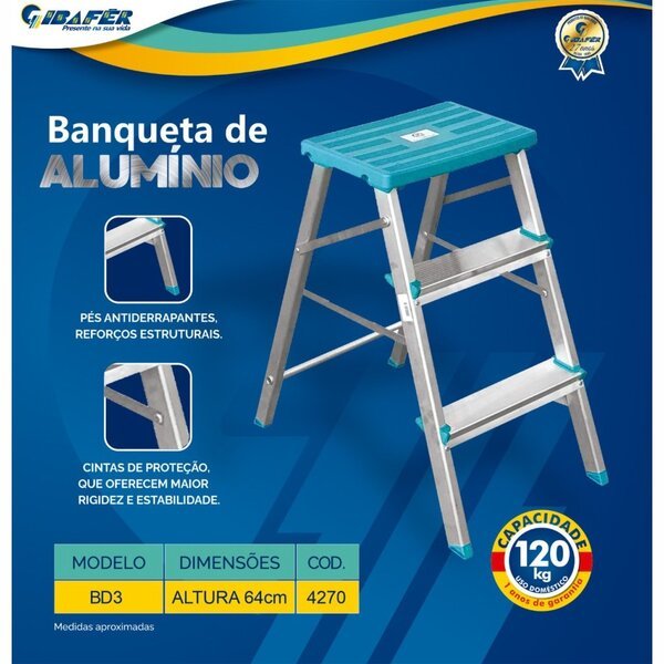 A banqueta escada doméstica 3 degraus alumínio gibafér é indicada para reparos rápidos em casa, sem comprometer a sua segurança, nada melhor do que ter uma escada robusta e prática. É por isso que gibafér criou para você uma linha de banquetas escadas totalmente confiáveis, desenvolvidas com os melhores e mais seguros componentes e montagem por pessoal especializado. Fabricada com materiais ultraleves, duráveis mesmo em áreas litorâneas e peças de plástico de polipropileno de alta resistência, o modelo com 3 degraus de alumínio gibafér é dobrável e fácil de guardar, sendo ideal para pequenos reparos e uso doméstico. Seus pés antiderrapantes e autotravantes proporcionam maior estabilidade e suporte na plataforma superior, suportando com segurança até 120 kg + carga, conforme manual de instruções. A banqueta escada de alumínio gibafér é fabricada em conformidade com as melhores especificações tecnicas, que assegura que a sua banque escada é fabricada dentro das melhores práticas. garantia de dois anos contra qualquer defeito de fabricação. Características:/n não enferruja não descasca leve prático durável características gerais do produto: marca: gibafér referência: 4270 indicado para: uso doméstico tipo: banqueta peso: 1,790 kg capacidade: 120 kg material: alumínio e polipropileno acompanha o produto: 01 banqueta escada doméstica 3 degraus alumínio gibafér